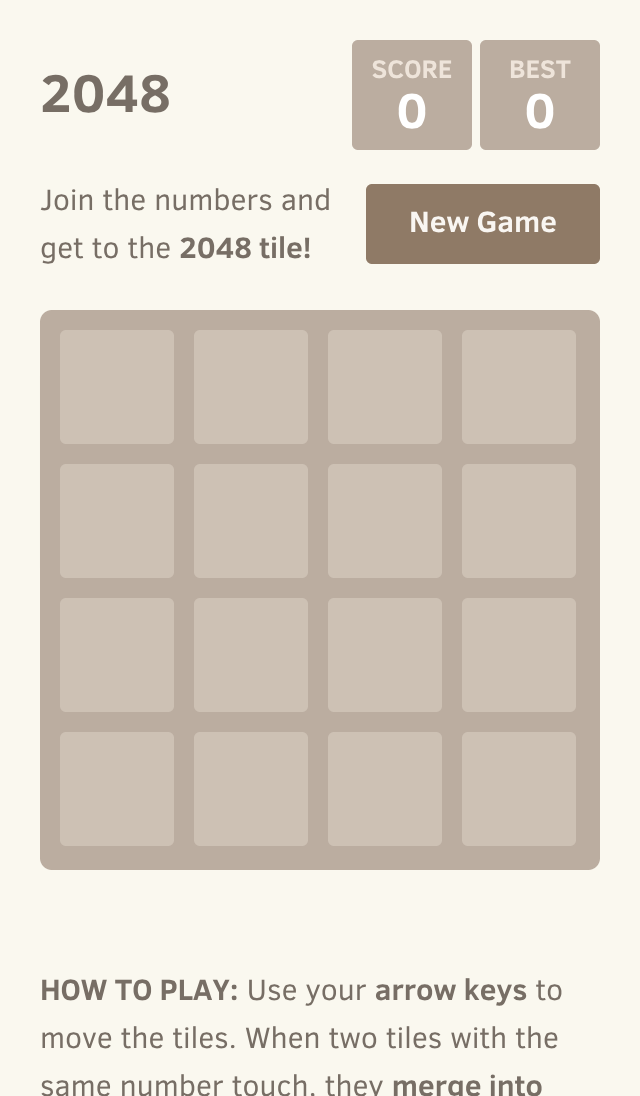 How to play: Use your arrow keys to move the tiles. When two tiles with the same size touch, they merge into one!